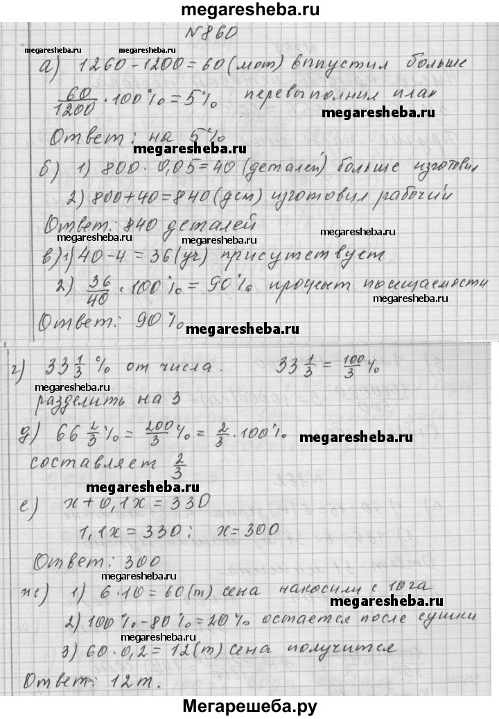 860. а) Завод выпустил 1260 моторов вместо 1200 по плану. На сколько процентов завод перевыполнил план? б) Рабочий по плану должен был изготовить 800 деталей, но он перевыполнил план на 5 %. Сколько деталей изготовил рабочий? в) В классе по списку 40 учеников, 4 сегодня отсутствуют. Каков процент посещаемости сегодня? г) Как проще найти 33*1/3 % от числа? д) Какую часть числа составляют 66*2/3 % ? е) Если к некоторому числу прибавить его 10 %, то получится 330. Найдите это число. ж) Трава при высыхании теряет 80 % своей массы. Сколько сена получится с луга площадью 10 га, если с одного гектара накашивают в среднем 6 т травы?