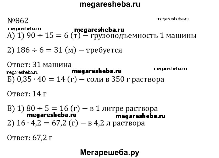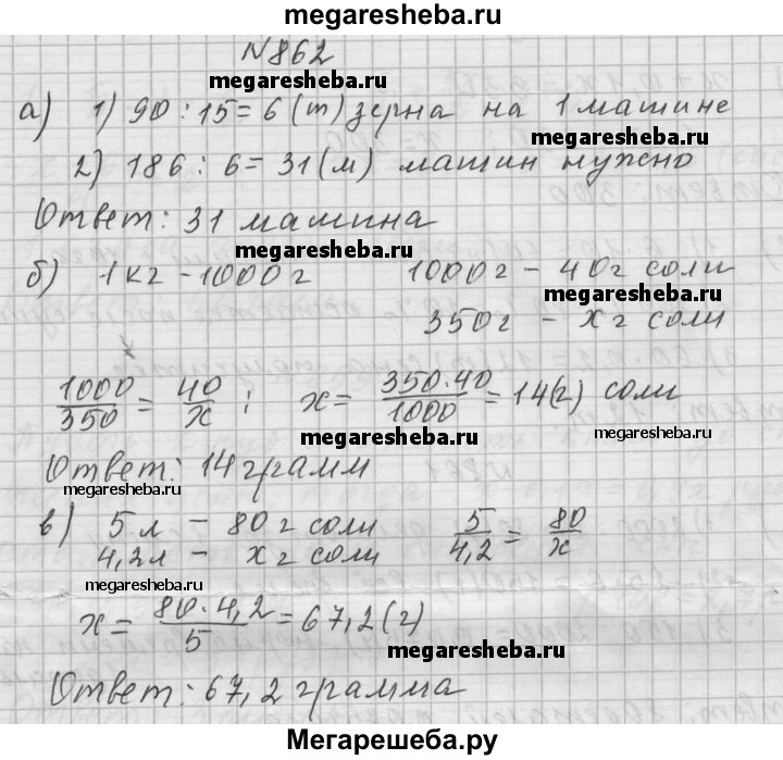 862. а) На 15 автомашинах одинаковой грузоподъёмности доставили на элеватор 90 т зерна. Сколько нужно таких машин, чтобы доставить на элеватор 186 т зерна? б) В 1 кг раствора содержится 40 г соли. Сколько соли содержится в 350 г этого раствора? в) В 5 л раствора содержится 80 г соли. Сколько соли содержится в 4,2 л такого же раствора?