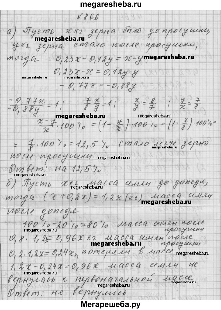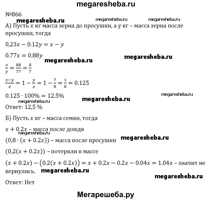 866. а) При проверке влажность зерна оказалась равной 23 %, а после просушки — 12 %. На сколько процентов стало легче зерно после просушки? б) Семена попали под дождь и стали на 20 % тяжелее. Когда их просушили, они потеряли в массе 20 %. Вернулись ли они к первоначальной массе?