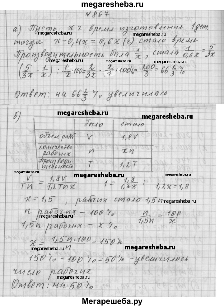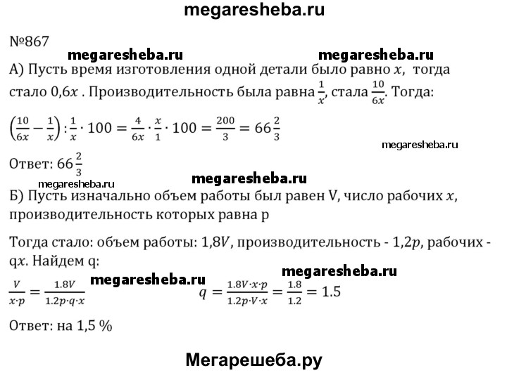 867. а) Время изготовления некоторой детали уменьшилось на 40 %. На сколько процентов увеличилась производительность труда? б) Объём строительных работ увеличился на 80 %. На сколько процентов нужно увеличить число рабочих для выполнения этой работы за то же время, если производительность труда будет увеличена на 20 %?
