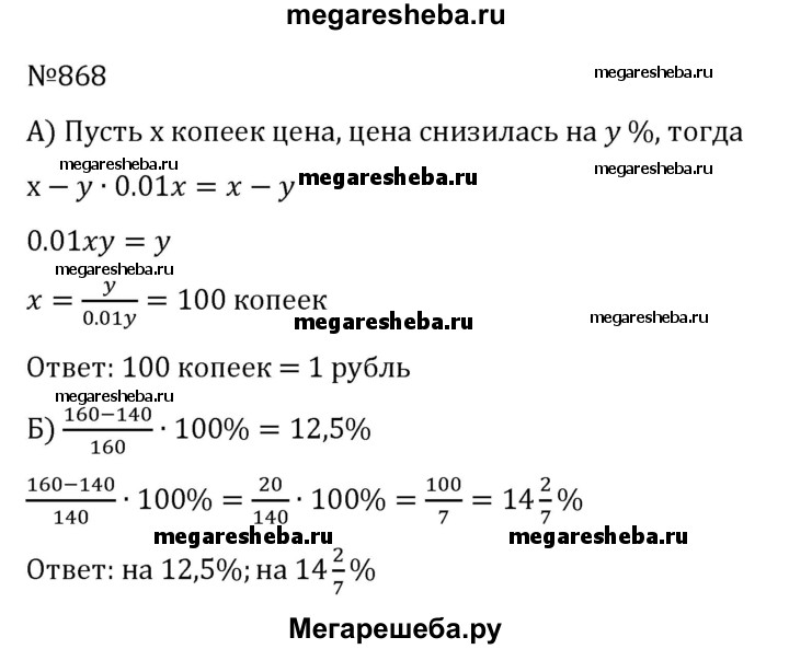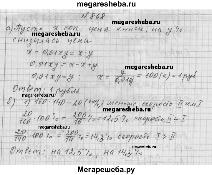 868. а) Цена книги снизилась на столько процентов, на сколько копеек она снизилась. Какова первоначальная цена книги? б) Две автомашины разных марок имеют максимальные скорости 160 км/ч и 140 км/ч. На сколько процентов скорость второй машины меньше скорости первой? На сколько процентов скорость первой машины больше скорости второй?