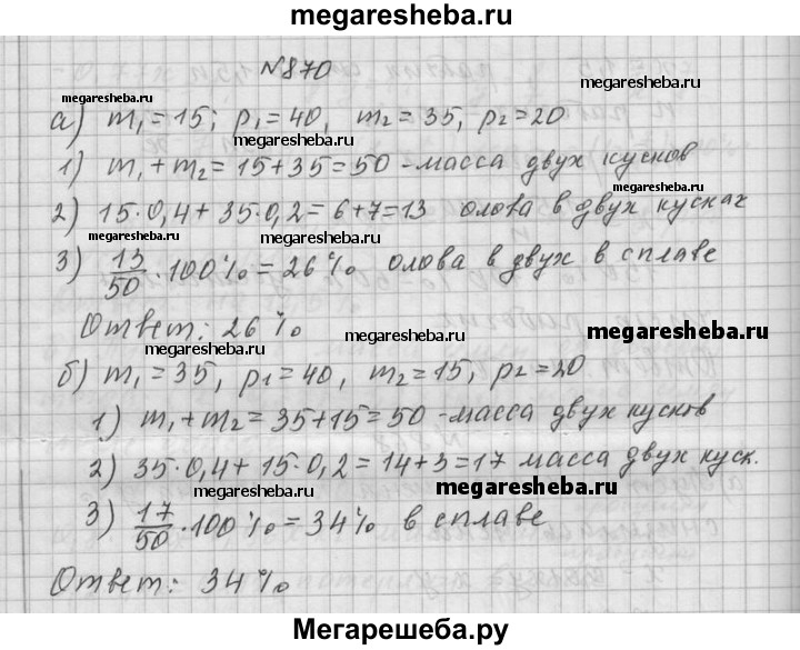 870. Найдите процентное содержание р олова в сплаве, полученном из двух кусков массами m1 и m2, содержащих соответственно p1 и р2 процента олова, если: а) m1 = 15, р1 = 40, m2 = 35, р2 = 20; б) m1 = 35, р1 = 40, m2 = 15, р2 = 20.