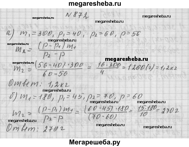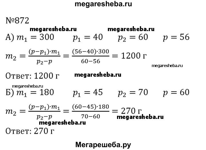 872. Имеется два куска сплава олова и свинца. Первый, массой m1 г, содержит р1 % олова, второй содержит р2 % олова. Сколько граммов от второго куска надо добавить к первому, чтобы получить сплав с содержанием олова р %, если: а) m1 = 300, р1 = 40, р2 = 60, р = 56; б) m1 = 180, р1 = 45, р2 = 70, р = 60?