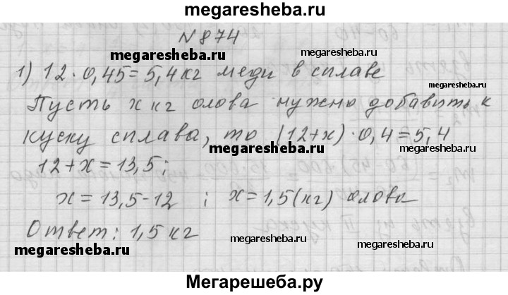 874. Имеется кусок сплава меди с оловом общей массой 12 кг, содержащий 45 % меди. Сколько килограммов олова надо прибавить к этому куску сплава, чтобы получившийся новый сплав содержал 40 % меди?