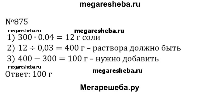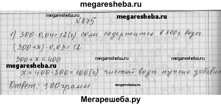 875. Сколько чистой воды нужно добавить к 300 г морской воды, содержащей 4 % соли, чтобы получить воду, содержащую 3 % соли?