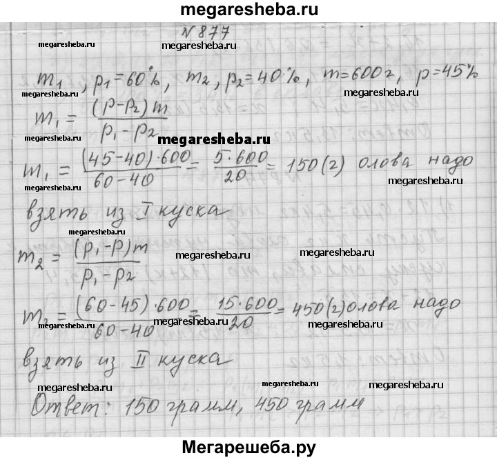 877. Имеются два куска, содержащие 60 % и 40 % олова. По скольку граммов от каждого куска надо взять, чтобы получить 600 г сплава, содержащего 45 % олова?