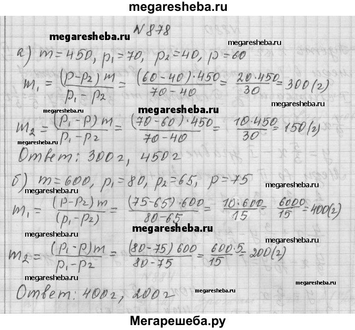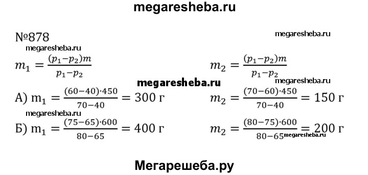 878. Имеются два куска, содержащие р1 и р2 процента олова. По скольку граммов от каждого куска надо взять, чтобы получить m г сплава, содержащего р % олова, если: а) m = 450, р1 = 70, р2 = 40, р = 60; б) m = 600, р1 - 80, р2 = 65, р= 75?