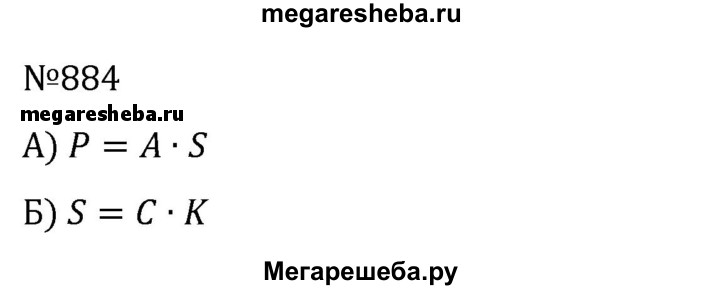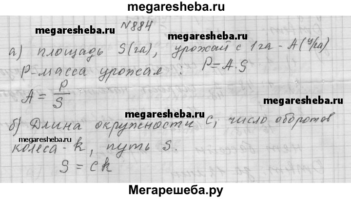 884. а) Урожай с 1 га равен А (ц/га), площадь, с которой убирают урожай, S (га), масса урожая Р (ц). Выразите зависимость между A, S, Р. б) Длина окружности колеса С, число оборотов колеса k, пройденный путь s. Выразите формулой зависимость между С, k, s.