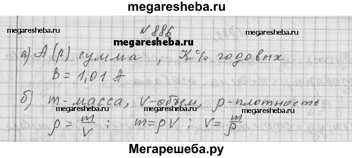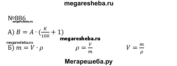 886. а) Вкладчик внёс в сберегательный банк вклад в сумме А (р.) под К % годовых. Выразите формулой сумму его вклада В через 1 год. б) Выразите формулой зависимость между массой га, объёмом V и плотностью р. Запишите соответствующие формулы для каждой переменной.