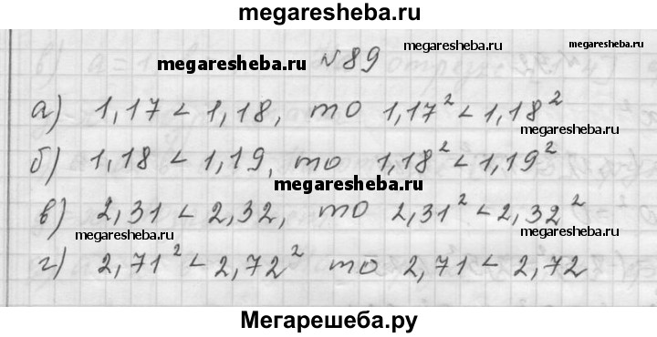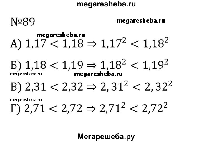 89. Сравните значения числовых выражений: а) 1,17^2 и 1,18^2; б) 1,18^2 и 1,19^2; в) 2,31^2 и 2,32^2; г) 2,71^2 и 2,72^2.