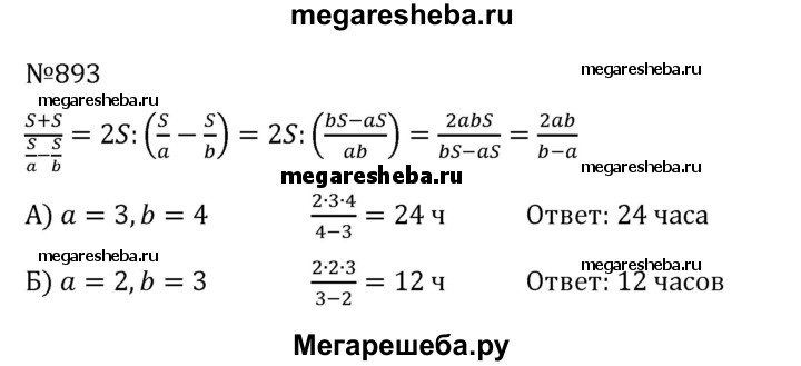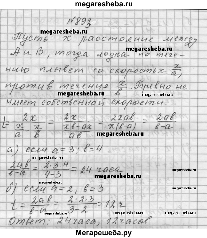 893. Лодка от А до В плывёт по течению а ч, а от В до А (против течения) — b ч. Сколько часов будет плыть бревно от А до В, если: а) а = 3, b = 4; б) а = 2, b = 3?