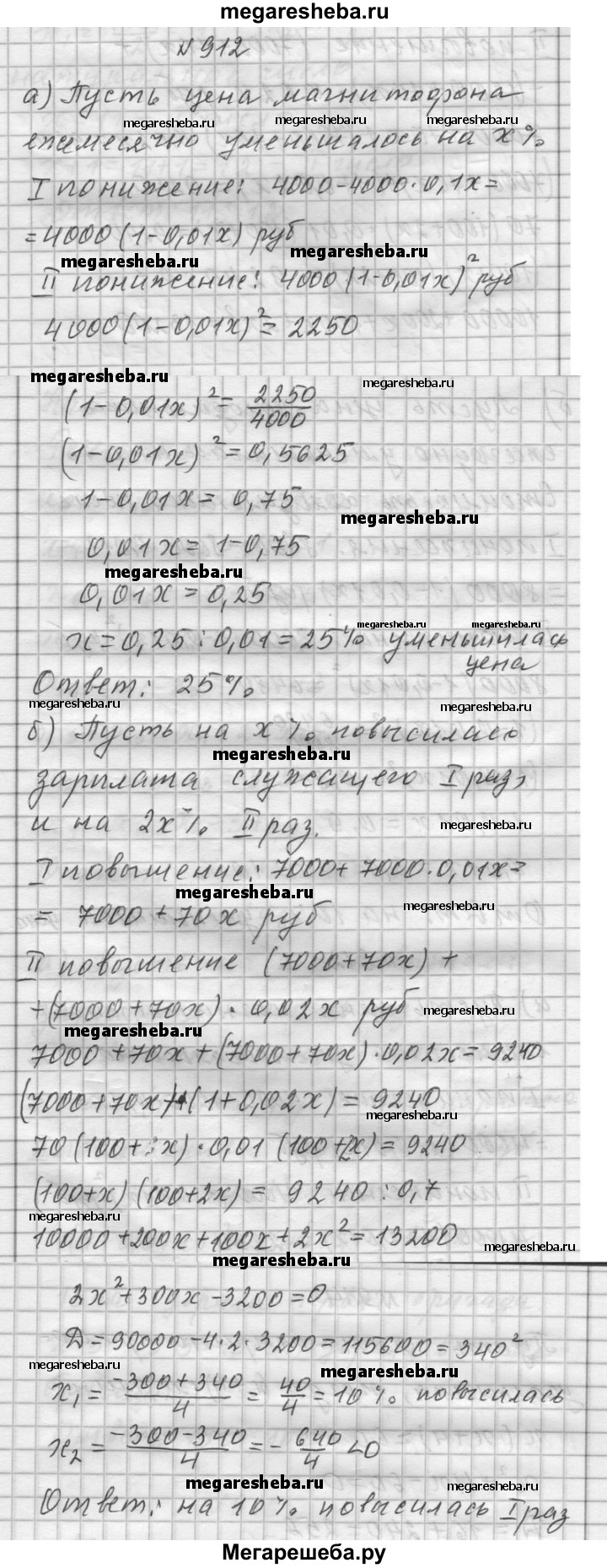 912. а) В комиссионном магазине цена товара, выставленного на продажу, ежемесячно уменьшается на одно и то же число процентов от предыдущей цены. Определите, на сколько процентов каждый месяц уменьшалась цена магнитофона, если, выставленный на продажу за 4000 р., он через два месяца был продан за 2250 р. б) Заработная плата служащего, равная 7000 р., повышалась два раза, причём во второй раз процент, на который она была повышена, был в два раза больше, чем в первый. На сколько процентов повышалась заработная плата в первый раз, если после второго повышения она составила 9240 р.