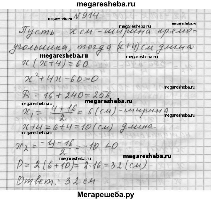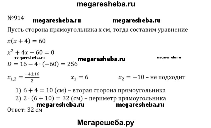 914. Найдите периметр прямоугольника, у которого одна сторона на 4 см больше другой и площадь которого равна 60 см2.