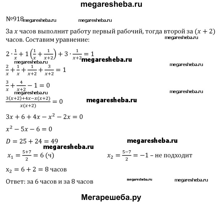 918. Двое рабочих должны выполнить некоторую работу. Вначале 2 ч работал первый, затем присоединился второй, и вместе они работали 1 ч. Оставшуюся после этого работу второй рабочий закончил за 3 ч. За какое время каждый может выполнить всю работу, если первому для выполнения всей работы нужно на 2 ч меньше, чем второму?