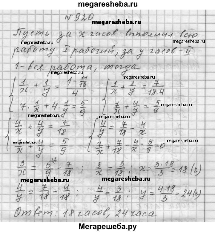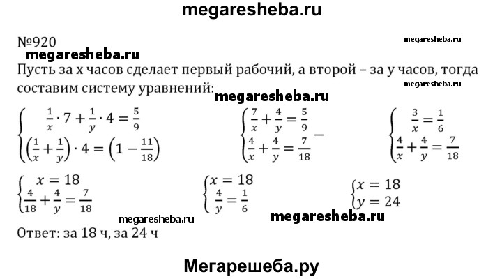 920. Двум рабочим было поручено изготовить партию одинаковых деталей. После того как первый проработал 7 ч, а второй — 4 ч, оказалось, что они выполнили 5/9 всей работы. Если бы они проработали совместно 4 ч, то им осталось бы выполнить 11/18 всей работы. За сколько часов, работая отдельно, каждый из них может выполнить всю работу?