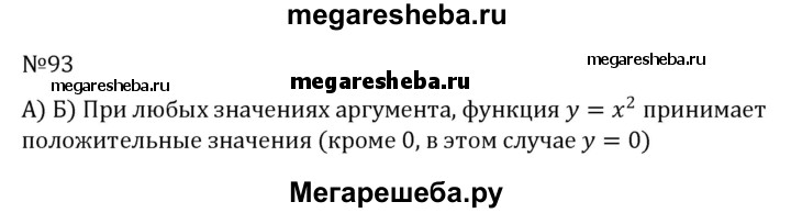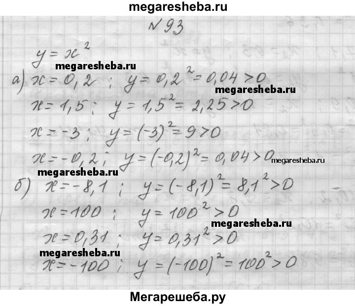 93. Определите знак значения функции у = х2 при каждом значении х: а) 0,2; 1,5; -3; -0,2; б) -8,1; -100; 0,31; 100.