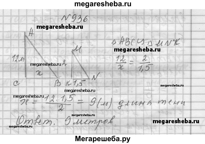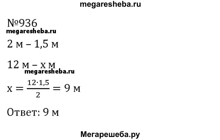 936. Какова длина тени от дерева высотой 12 м, если от двухметрового шеста отбрасывается тень длиной 1,5 м?