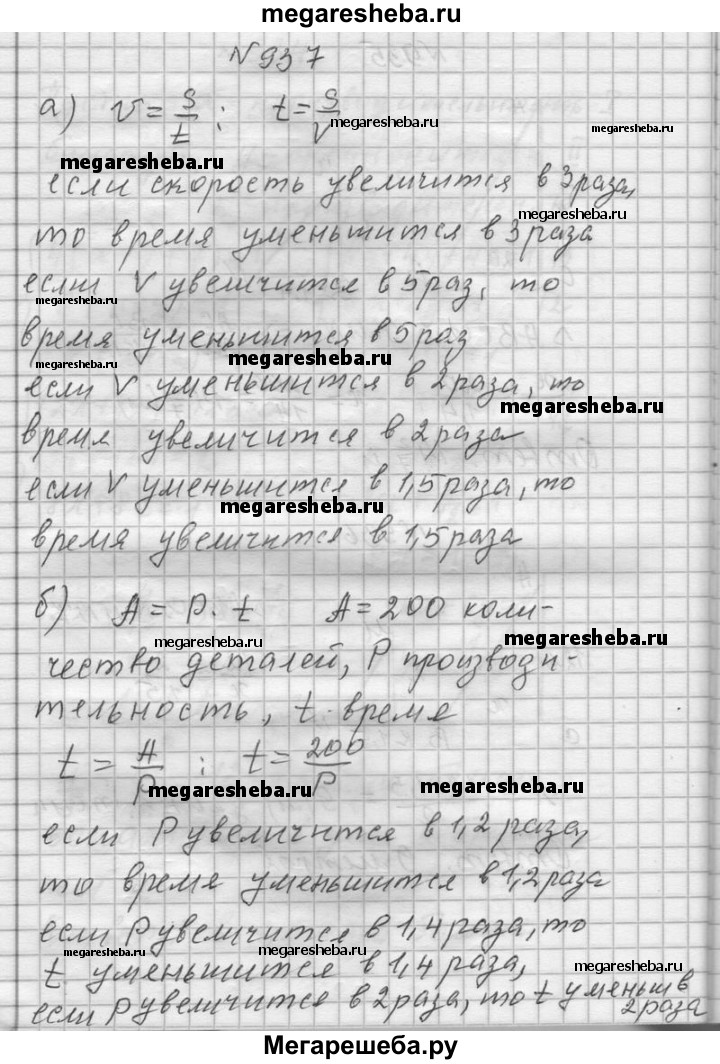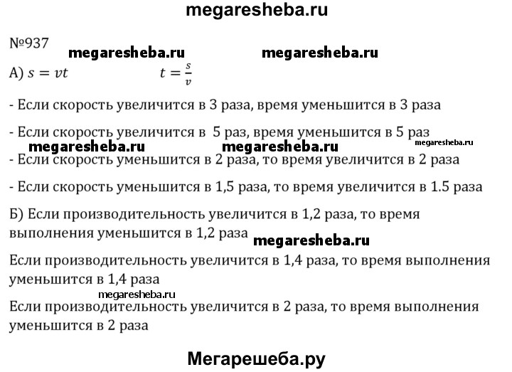 937. а) В формуле равномерного прямолинейного движения выразите время через расстояние и скорость. Как изменится время движения, если расстояние останется прежним, а скорость увеличится в 3 раза, в 5 раз; уменьшится в 2 раза, в 1,5 раза? б) Рабочему необходимо изготовить 200 деталей. Запишите формулу зависимости времени выполнения заказа от производительности труда (количество деталей, изготовляемых в единицу времени). Как изменится время выполнения работы, если производительность труда увеличится в 1,2 раза, в 1,4 раза, в 2 раза?