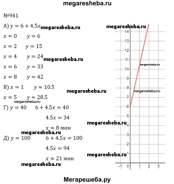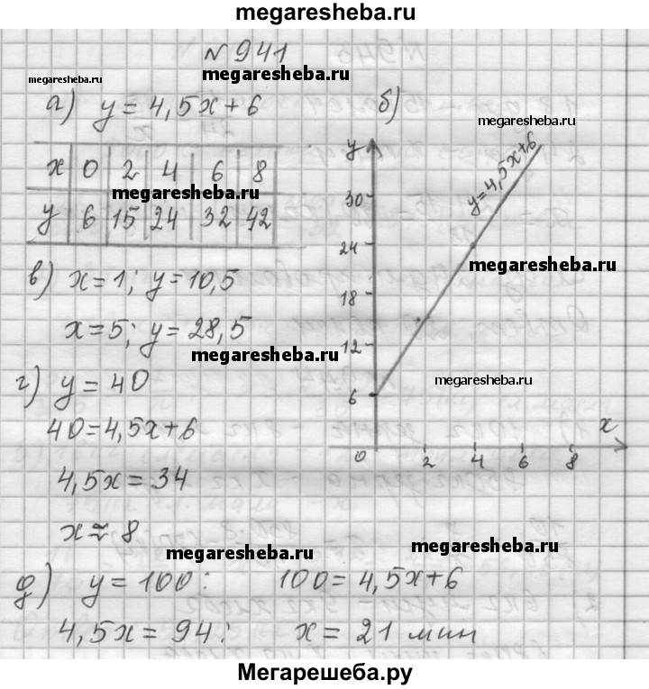 941. В баке 6 л воды. Каждую минуту в него через кран вливают 4,5 л воды. а) Запишите зависимость между числом литров воды в баке (у) и временем (x), в течение которого открыт кран. б) Начертите график изменения у, давая х значения от 0 до 8 через 2. в) Найдите по графику, сколько воды будет в баке через 1 мин, через 5 мин. г) Через сколько минут в баке будет 40 л воды? (Округлите с точностью до 1 мин.) д) Через сколько минут бак будет заполнен, если он вмещает 100 л воды? (Округлите с точностью до 1 мин.)