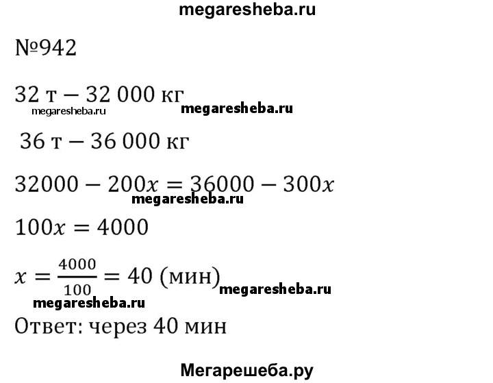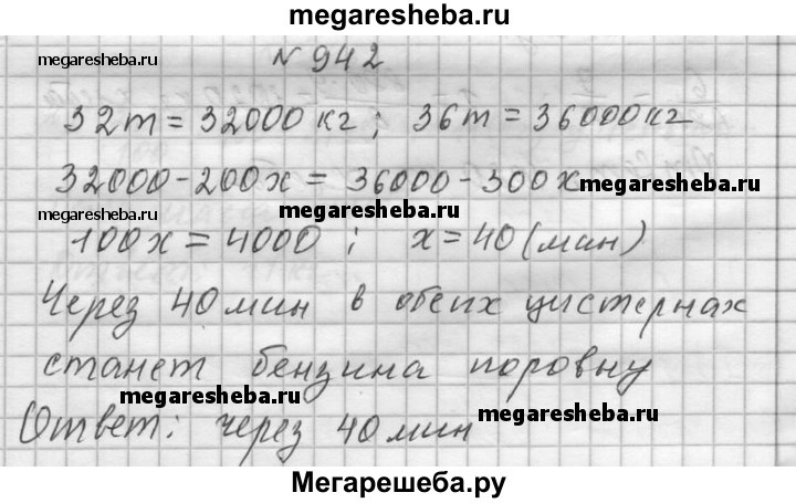 942. В одной цистерне 32 т бензина, а в другой — 36 т. Из первой выкачивают каждую минуту по 200 кг, а из второй — по 300 кг бензина. Через какое время в обеих цистернах станет бензина поровну?