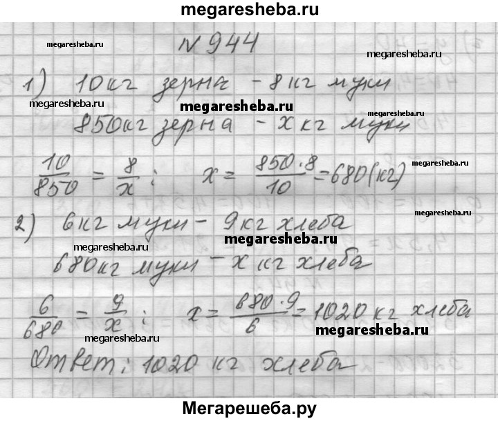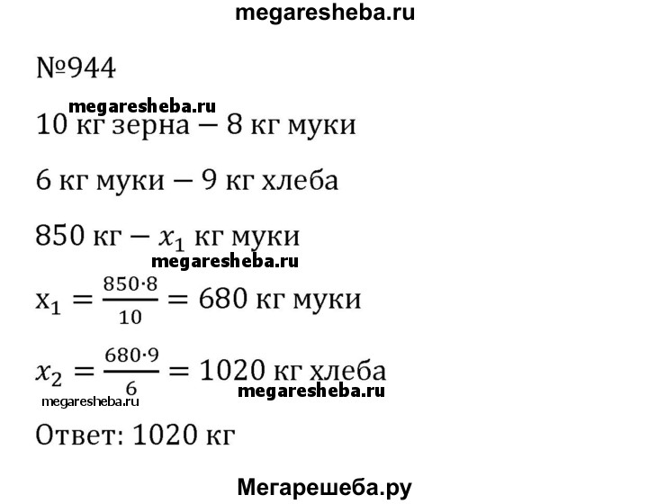 944. Сколько килограммов хлеба можно получить из 850 кг пшеницы, если из 10 кг зерна получается 8 кг пшеничной муки, а из 6 кг муки — 9 кг хлеба?