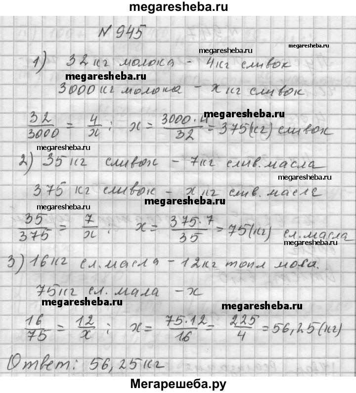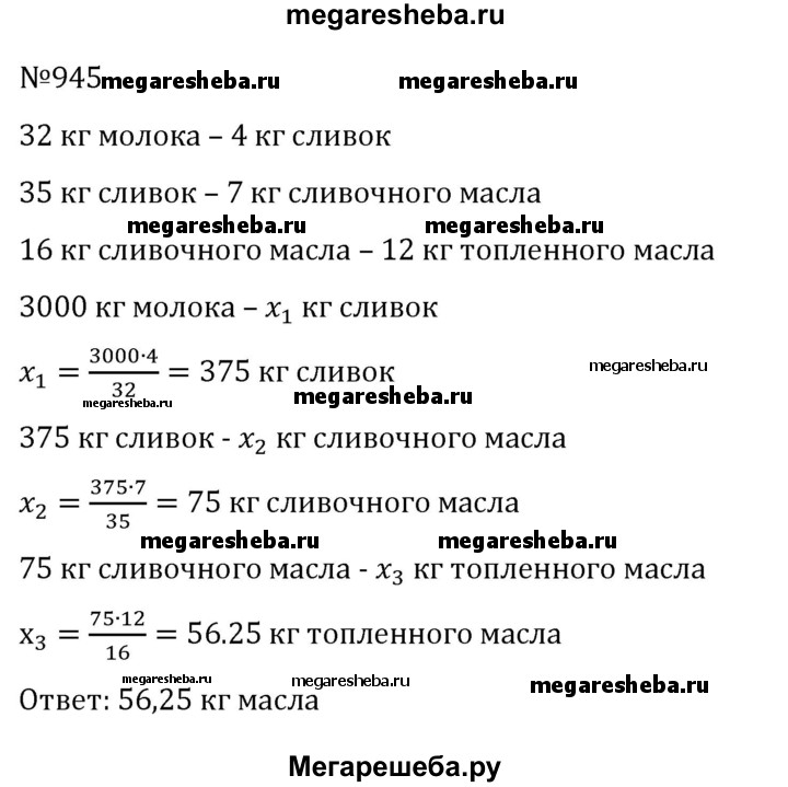 945. Из 32 кг молока получается 4 кг сливок, из 35 кг сливок получается 7 кг сливочного масла, а из 16 кг сливочного масла получается 12 кг топлёного масла. Сколько килограммов топлёного масла можно получить из 3000 кг молока?