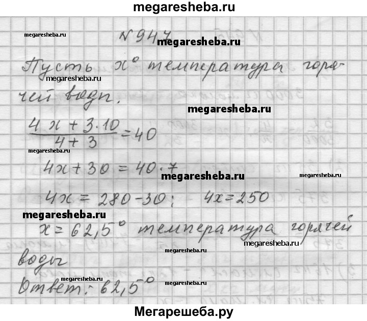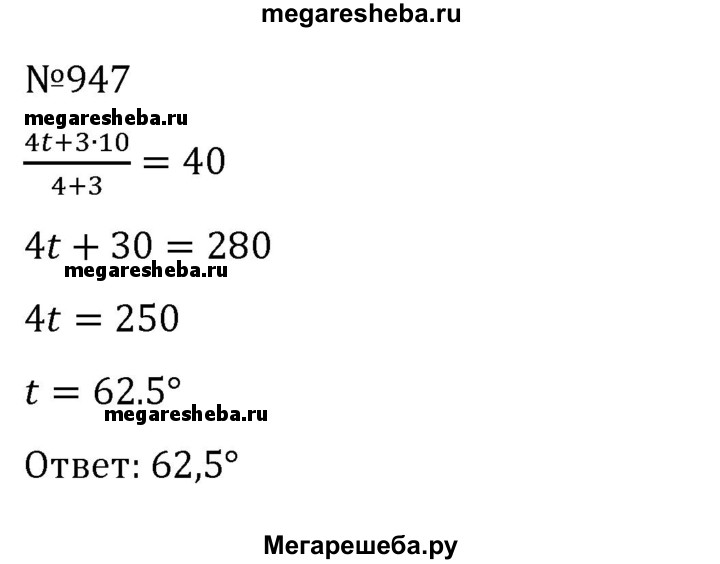 947. Смешали 4 л горячей воды и 3 л воды, температура которой 10 °С. Температура смеси оказалась равной 40 °С. Найдите температуру горячей воды.