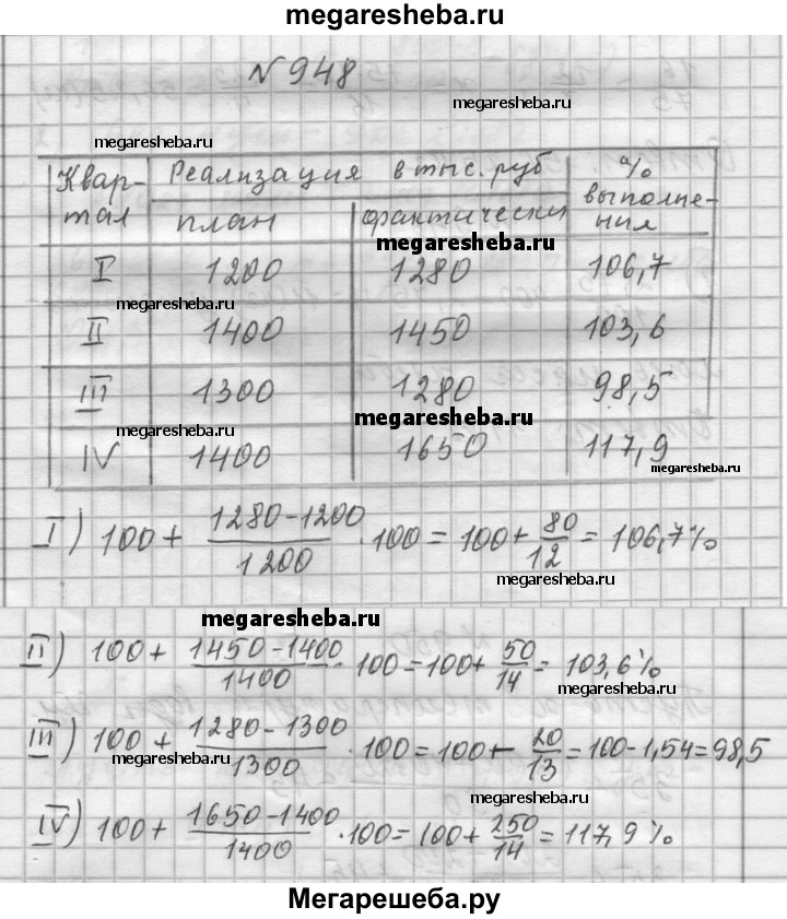 948. Вычислите в процентах с точностью до 0,1 выполнение плана реализации продукции в каждом квартале на основе следующих данных: