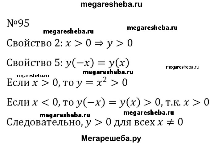95. Покажите, что из свойств 2 и 5 функции у = х2 следует, что у > 0 для всех х ≠ 0.