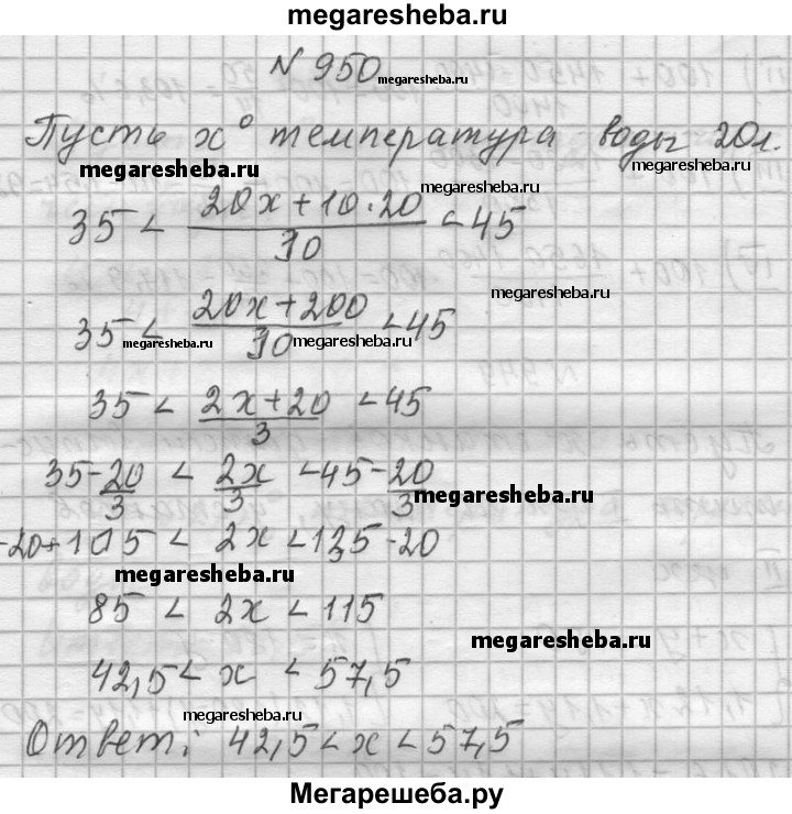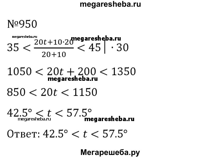950. Какой должна быть температура 20 л воды, чтобы при смешении её с 10 л воды, температура которой 20 °С, получить воду с температурой не менее 35 °С и не более 45 °С?