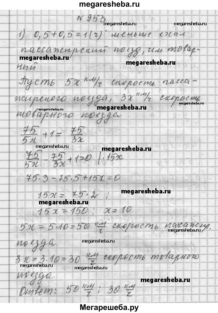 953. Скорости двух поездов, пассажирского и товарного, относятся как 5 : 3. Пассажирский поезд вышел со станции на 0,5 ч позже товарного, но прибыл на следующую станцию на 0,5 ч раньше товарного. Найдите скорости поездов, считая их постоянными, если расстояние между станциями равно 75 км.
