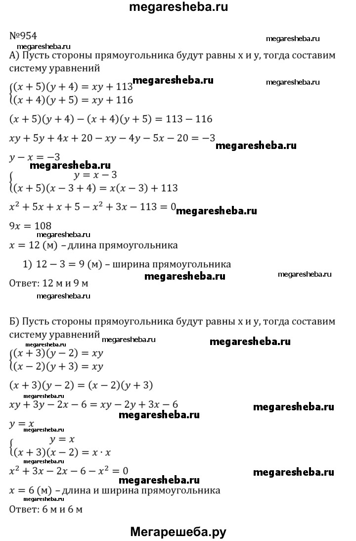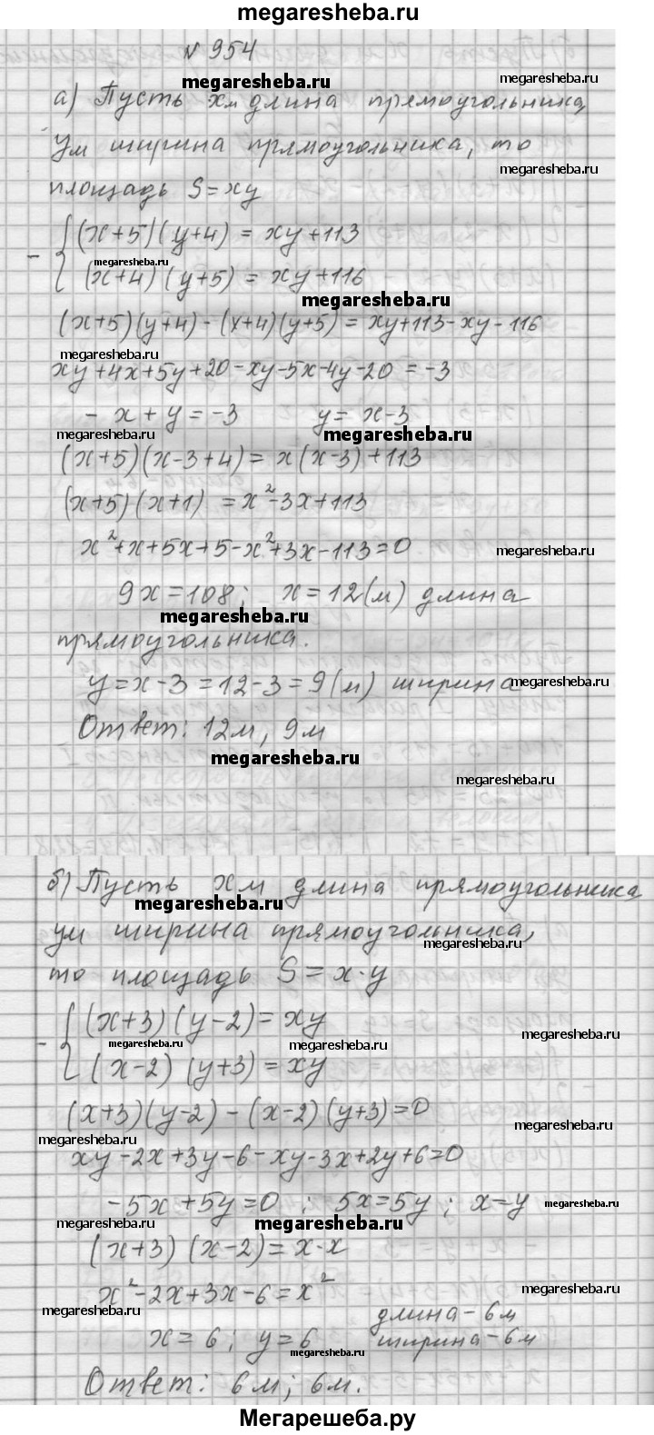 954. а) Если одну из сторон прямоугольника увеличить на 5 м, а вторую — на 4 м, то площадь прямоугольника увеличится на 113 м2. Если же первую сторону увеличить на 4 м, а вторую — на 5 м, то площадь увеличится на 116 м2. Определите длину и ширину прямоугольника. б) Если длину прямоугольника увеличить на 3 м, а ширину уменьшить на 2 м, то площадь прямоугольника не изменится. Также не изменится площадь прямоугольника, если длину его уменьшить на 2 м, а ширину увеличить на 3 м. Определите длину и ширину прямоугольника.