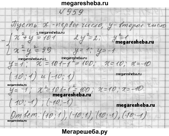 959. Найдите два числа, сумма квадратов которых 101, а разность квадратов 99. Сколько решений имеет задача?