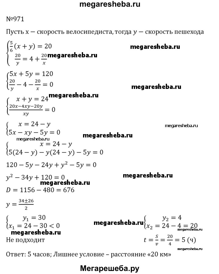 971. Из пункта А в пункт В, расстояние между которыми 20 км, вышел пешеход. Одновременно с ним из пункта В в пункт А выехал велосипедист, который встретил пешехода через 50 мин после своего выезда из В. Сколько времени потребовалось бы пешеходу для того, чтобы пройти весь путь из А в В, если известно, что велосипедист проделал бы тот же путь на 4 ч быстрее пешехода? Какое условие является лишним?