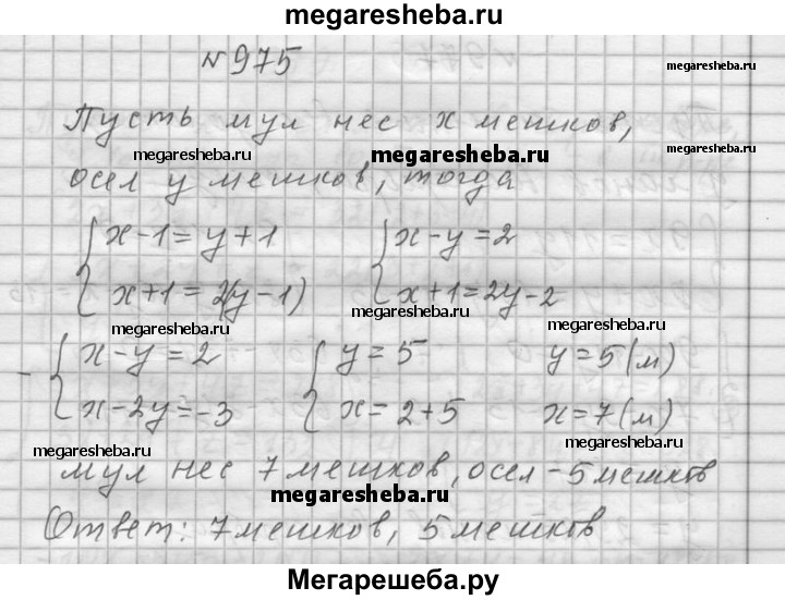 975. Задача Евклида (III в. до н.э.). Мул и осёл по дороге с мешками шагали. Осёл жаловался на свою непомерно тяжёлую ношу. Мул обратился к попутчику с речью: «Если я возьму у тебя один мешок, то моя ноша станет вдвое тяжелее твоей. А вот если бы ты взял у меня один мешок, то наши ноши сравнялись бы». Сколько нёс каждый из них?
