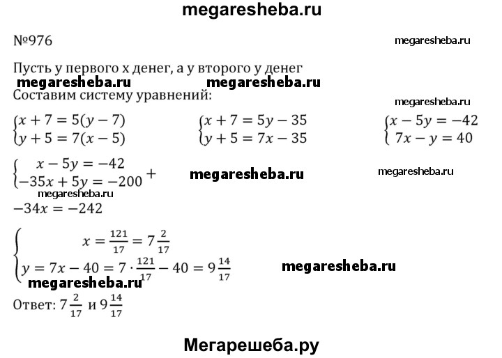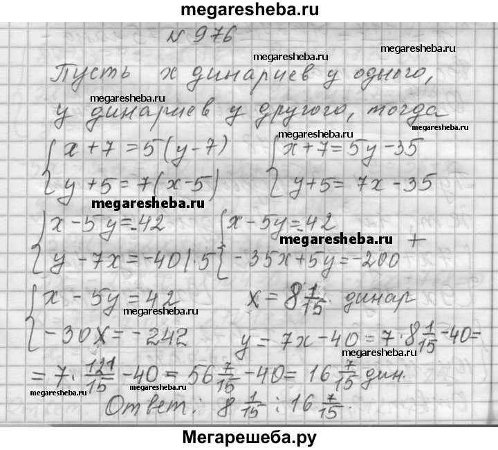 976. Задача Леонардо Пизанского (Фибоначчи). Один говорит другому: «Дай мне 7 динариев, и я буду в 5 раз богаче тебя». А другой говорит: «Дай мне 5 динариев, и я буду в 7 раз богаче тебя». Сколько денег у каждого?