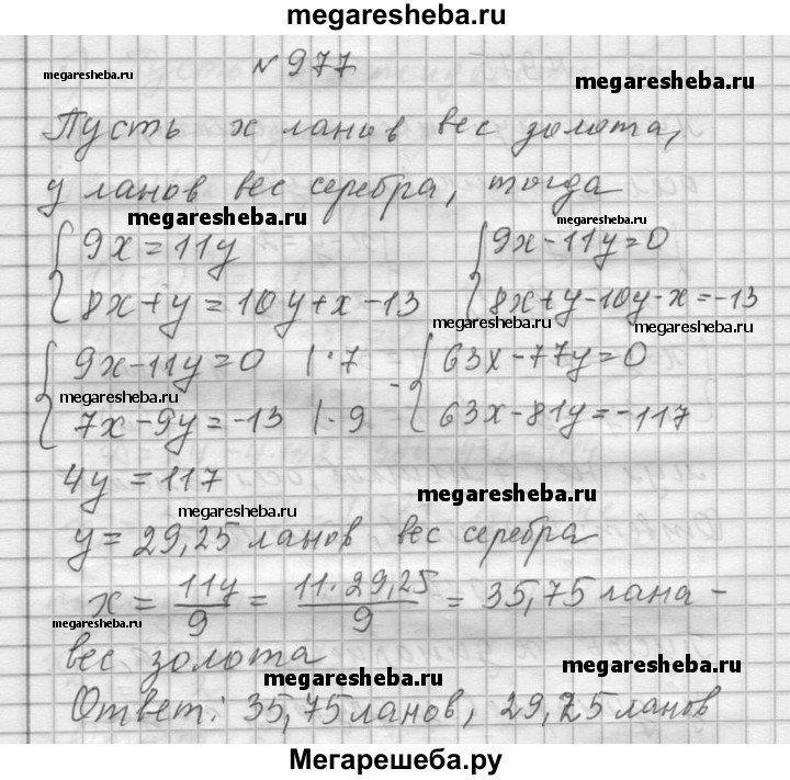 977. Старинная задача (Китай, I в.). Имеется 9 слитков золота и 11 слитков серебра, их взвесили, вес как раз совпал. Переложили слиток золота и слиток серебра, золото стало легче на 13 ланов. Спрашивается, каков вес слитка золота и слитка серебра, каждого в отдельности.