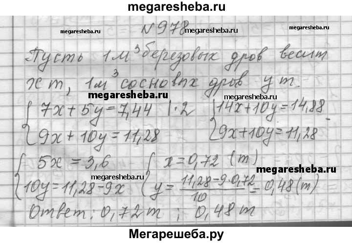978. Имеются берёзовые и сосновые дрова. 7 м3 берёзовых и 5 м3 сосновых дров весят 7,44 т, а 9 м3 берёзовых и 10 м3 сосновых дров весят 11,28 т. Сколько весит 1 м3 берёзовых и 1 м3 сосновых дров?