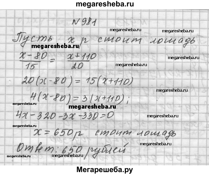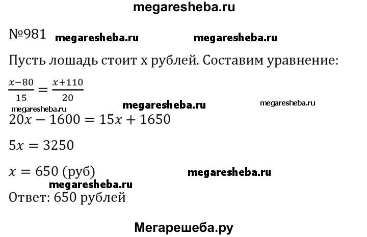 981. Старинная задача. Крестьянин хочет купить лошадь и для этого продаёт рожь. Если он продаст 15 ц ржи, то ему не хватит для покупки лошади 80 р., а если он продаст 20 ц ржи, то у него останется 110 р. Сколько стоит лошадь?