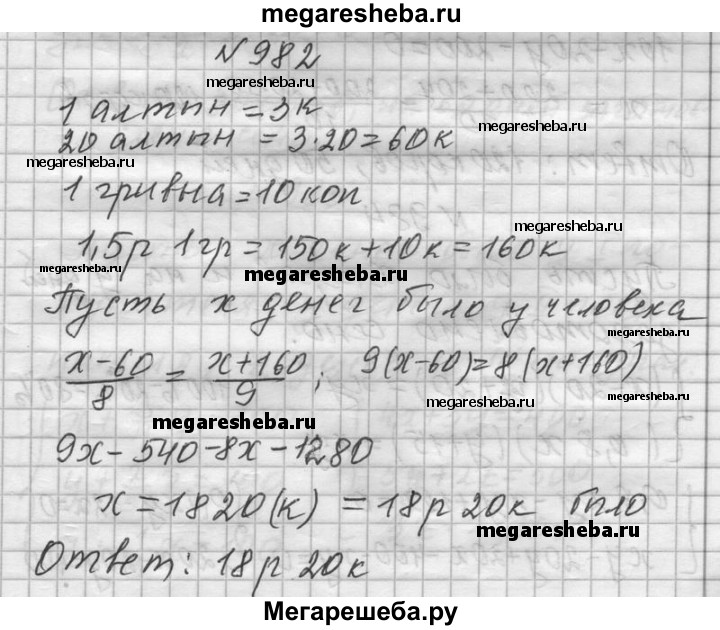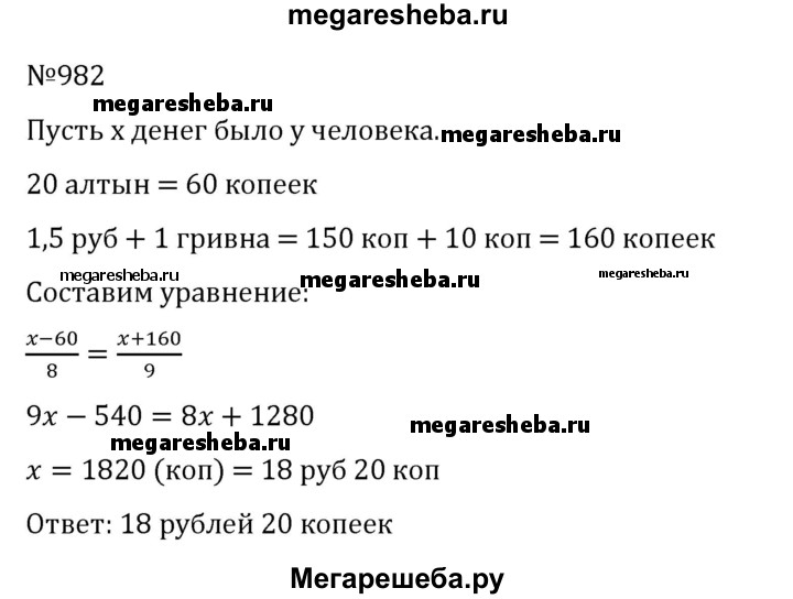982. Старинная задача. Некий человек покупал масло. Когда он давал деньги за 8 бочек масла, то у него осталось 20 алтын. Когда же стал давать за 9 бочек, то не хватило денег полтора рубля с гривною. Сколько денег было у человека? (1 алтын = 3 к., 1 гривна = 10 к.)