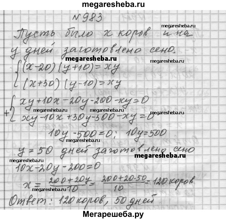 983. Если продать 20 коров, то заготовленного сена хватит на десять дней дольше, если же прикупить 30 коров, то запас сена исчерпается десятью днями раньше. Сколько было коров и на сколько дней заготовлено сена?