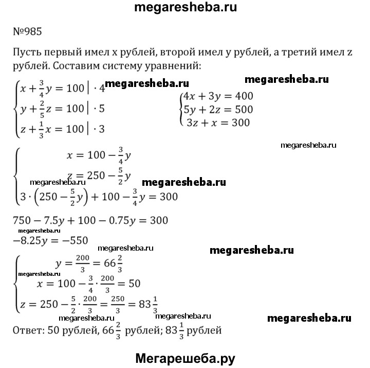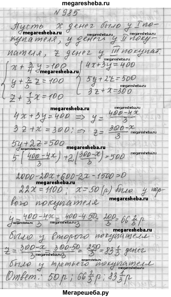 985. Из «Арифметики» Л. Ф. Магницкого. Три человека хотят двор купить. Первый покупатель говорит второму: дашь мне 3/4 денег, что имеешь, и я один заплачу цену за двор. Второй говорит третьему: дашь мне 2/5 из твоих денег, и я один заплачу цену за двор. Третий говорит первому: дашь мне 1/3 из твоих денег, и я один заплачу цену за двор. А двору цена 100 р. Сколько каждый из покупателей имел денег?
