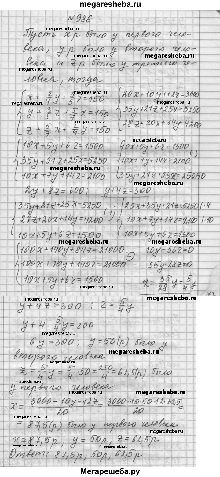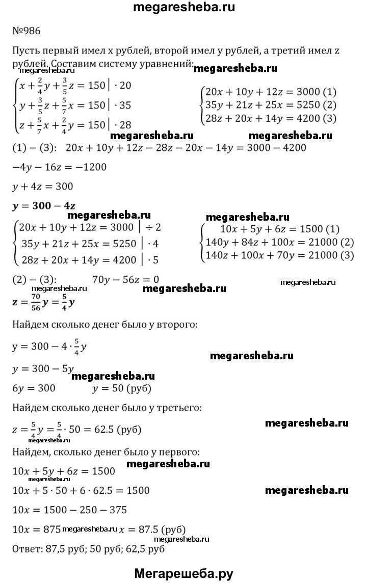986. Из «Арифметики» Л. Ф. Магницкого. Три человека разговаривали между собой. Первый из них говорит второму: если бы мне взять от твоих денег 2/4, а от третьего 3/5 тогда было бы у меня 150 р. Второй говорит третьему: если бы я взял твоих 3/5 денег , а от первого 5/7, то я тоже имел бы 150 р. Третий говорит первому: если бы я взял от твоих денег 5/7, а от второго 2/4, то тоже имел бы 150 р. Спрашивается, сколько каждый из них в то время имел денег.