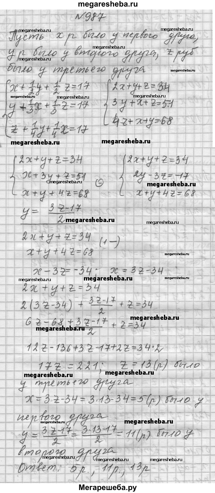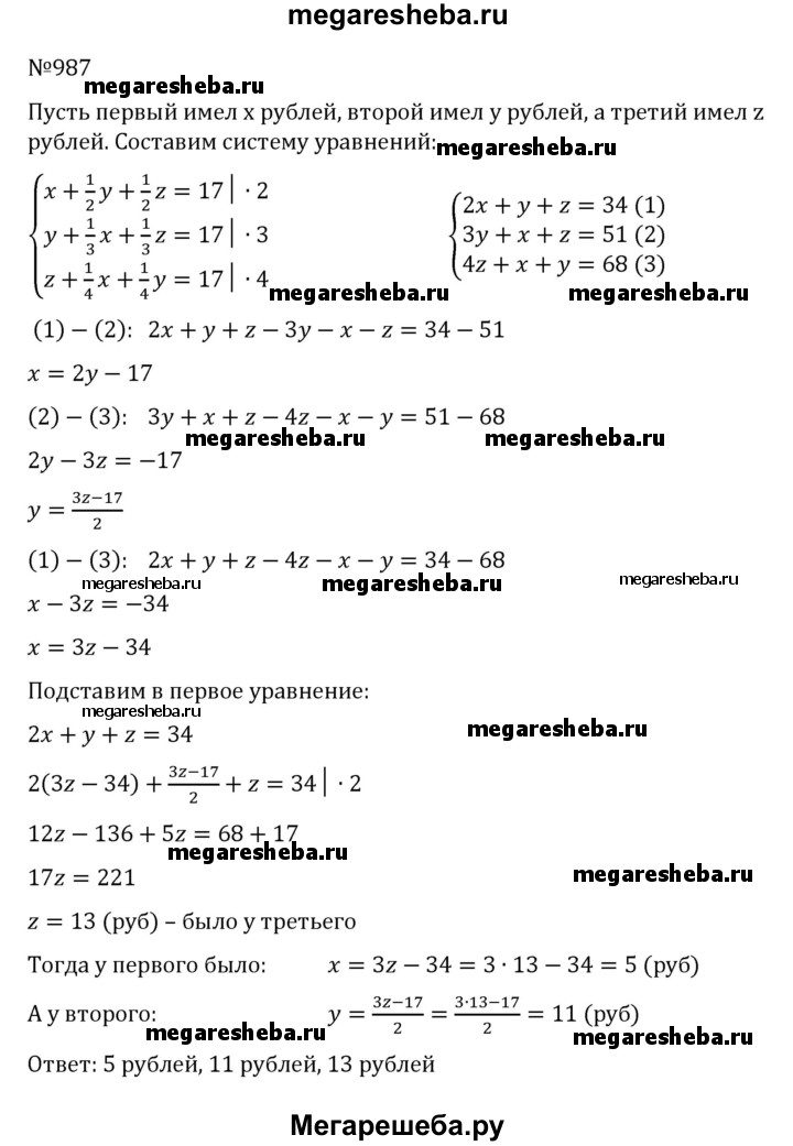 987. Три друга хотели купить книгу за 17 р., но ни у кого не набралось нужной суммы. Первый говорит друзьям: «Дайте мне каждый по половине своих денег, и я куплю книгу». Второй говорит: «Дайте мне по трети своих денег, и я куплю книгу». Третий говорит: «Дайте мне по четверти своих денег, и я куплю книгу». Сколько денег было у каждого?