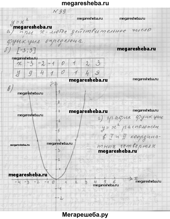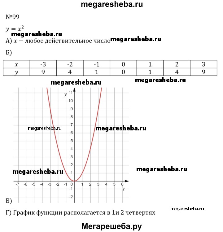 99. Задана функция у = х2. а) При каких значениях х определена данная функция? б) Вычислите значения у, взяв значения х от -3 до 3 через единицу. Решение оформите в виде таблицы. в) Постройте систему координат хОу, взяв единичные отрезки по 1 см. Постройте точки по вычисленным координатам и соедините их непрерывной линией. г) В каких координатных четвертях располагается график функции у = х2?