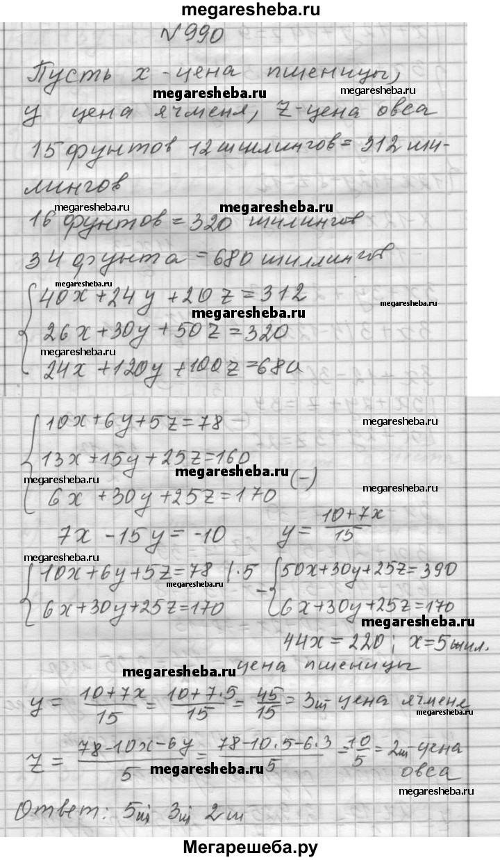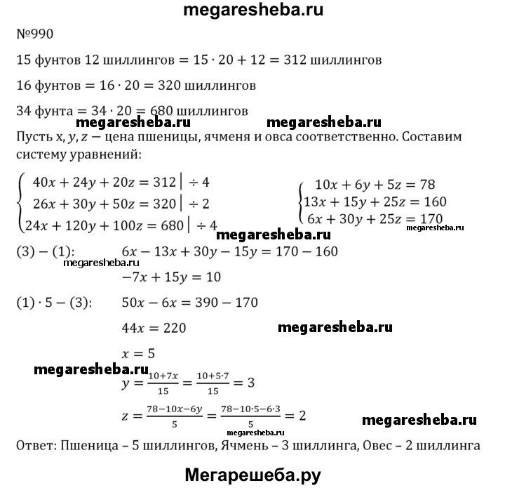990. Из «Всеобщей арифметики» И. Ньютона. Некто покупает 40 мер пшеницы, 24 ячменя и 20 овса за 15 фунтов 12 шиллингов . Затем он производит вторую закупку тех же сортов в 26 мер пшеницы, 30 ячменя и 50 овса за 16 фунтов. Наконец, он делает третью закупку тех же сортов в 24 меры пшеницы, 120 ячменя и 100 овса за 34 фунта. Спрашивается цена меры каждого рода зерновых.