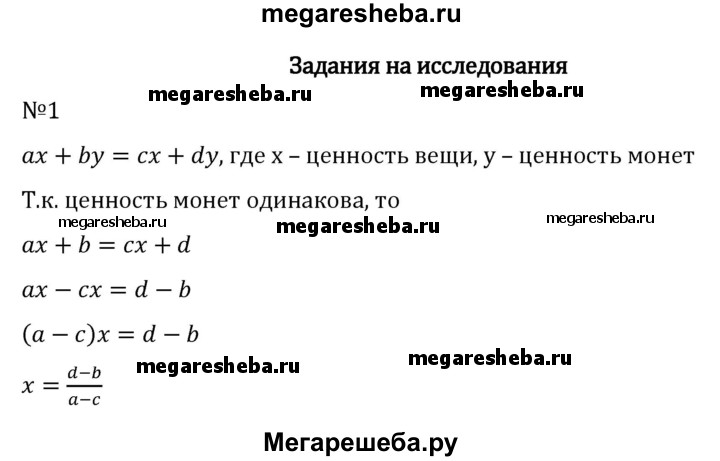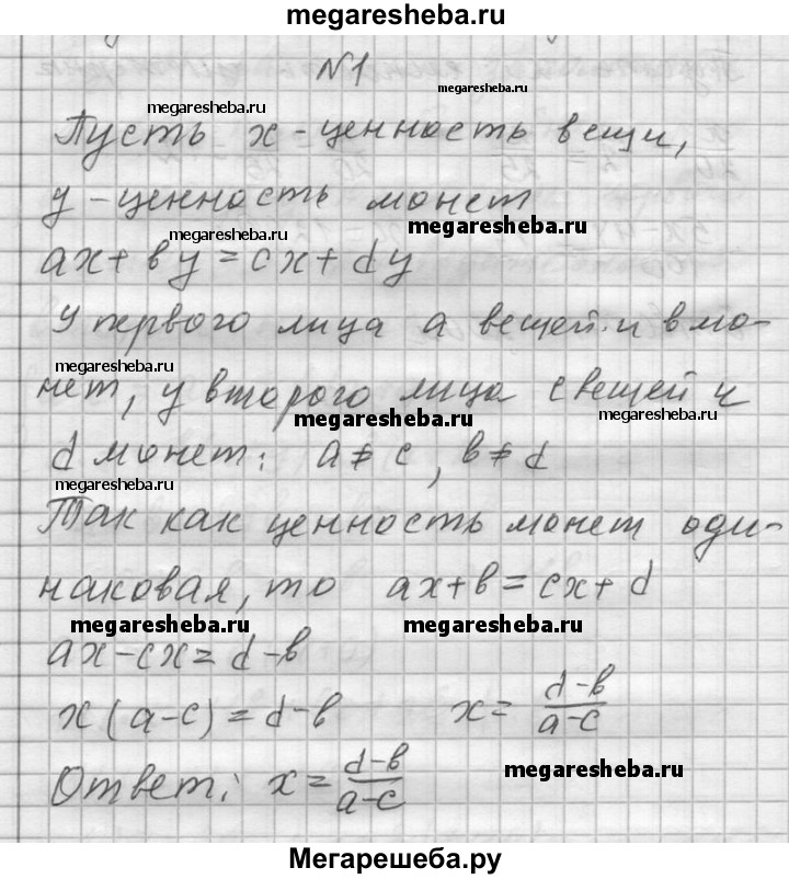 1. Задача Ариабхаты (476 — ок. 550). Два лица имеют равные капиталы, причём каждый состоит из известного числа вещей одинаковой стоимости и известного числа монет. Но как число вещей, так и суммы денег у каждого различны. Какова ценность вещи? Указание. Считайте, что у первого лица а вещей и b монет, а у второго лица с вещей и d монет (а ≠ с и b ≠ d).