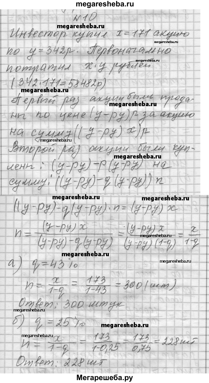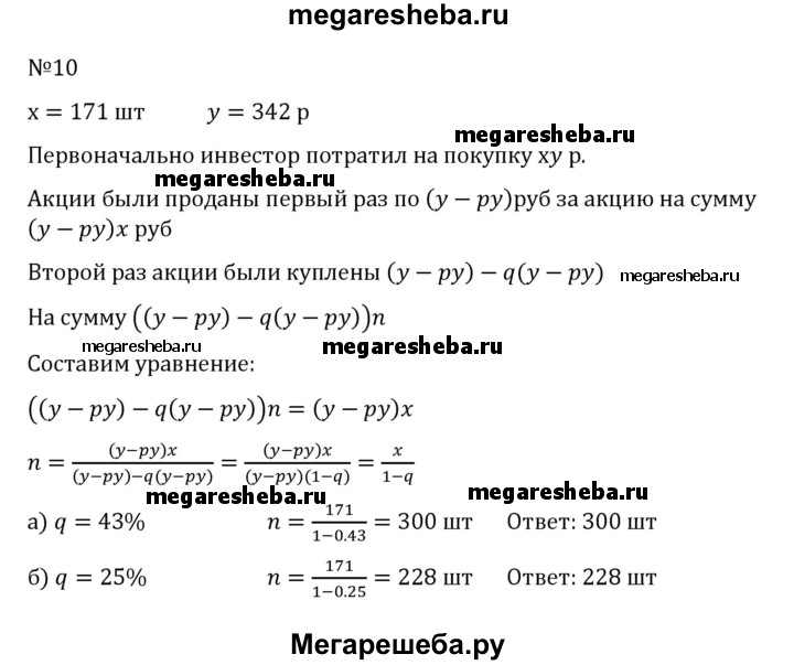 10. Инвестор купил 171 акцию известной компании по 342 р. за штуку. Через некоторое время разразился финансовый кризис, акции упали в цене и инвестор продал их на р % дешевле, чем купил сам. А когда кризис закончился, инвестор решил вложить все деньги, вырученные от неудачной продажи акций, в покупку большего числа тех же акций, которые со времени неудачной продажи стали дешевле на q %. Сколько акций купил инвестор во второй раз, если: a) q = 43; б) q = 25?
