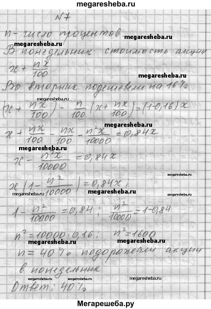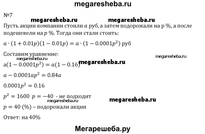 7. В понедельник акции компании А подорожали на некоторое число процентов, а во вторник подешевели на то же число процентов. В результате они стали стоить на 16 % дешевле, чем при открытии торгов в понедельник. На какое число процентов подорожали акции компании А в понедельник?