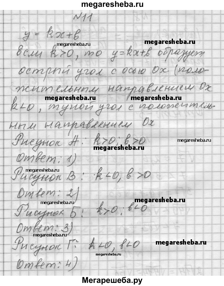 11. Даны четыре прямые у = kx + b. Для каждой прямой определите соответствующие ей знаки коэффициентов k и b. 1) k > 0, b > 0 2) k < 0, b > О 3) k > 0, b < 0 4) k < 0, b < О